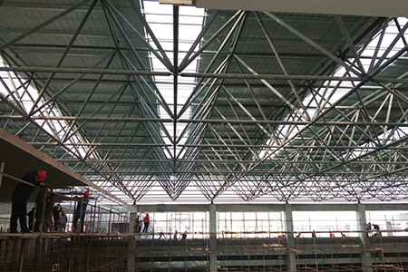 2、鋼網(wǎng)架是由多根鋼桿件按照一定的網(wǎng)格形式通過節(jié)點(diǎn)連結(jié)而成的空間結(jié)構(gòu)。構(gòu)成網(wǎng)架的基本單元有三角錐,三棱體,正方體,截頭四角錐等,由這些基本單元可組合成平面形狀的三邊形,四邊形,六邊形,圓形或其他任何形體。具有空間受力、重量輕、剛度大、抗震性能好等優(yōu)點(diǎn);可用作體育館、 影劇院、展覽廳、候車廳、體育場看臺(tái)雨篷、飛機(jī)庫、雙向大柱網(wǎng)架結(jié)構(gòu)距車間等建筑的屋蓋。缺點(diǎn)是匯交于節(jié)點(diǎn)上的桿件數(shù)量較多,制作安裝較平面結(jié)構(gòu)復(fù)雜。